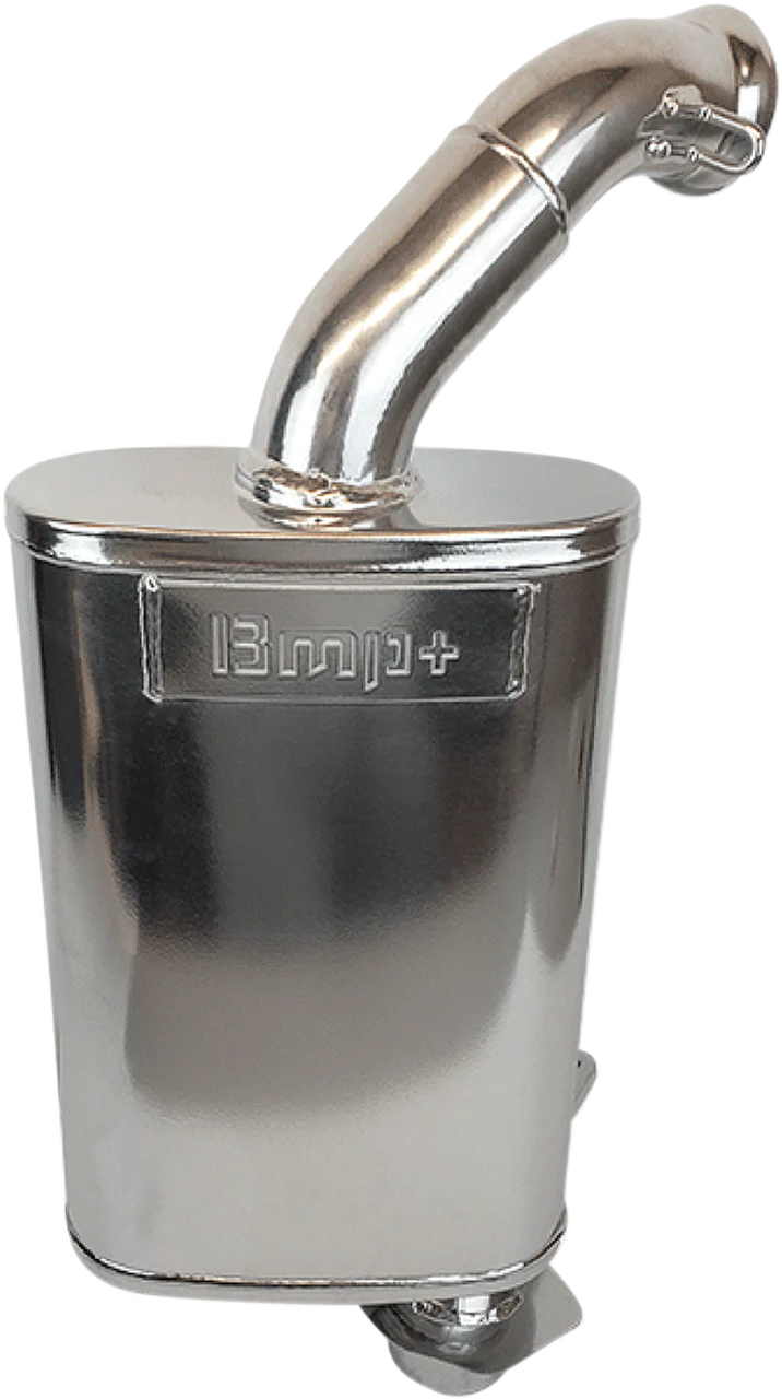This is a great muffler for those looking to keep quiet down low but like a little bark once in a while! From idle to 1/3 throttle you can barely tell this is not a stock muffler. In the mid-range, you will notice a nice deep tone a little louder than stock. When you hit higher RPM this muffler has an exceptionally good tone with a mean sound. This muffler has a special thermal barrier and internal packing that keeps it very cool on the outside. You can nearly put your hand on the muffler after running the motor, which greatly reduces under the hood heat! All mufflers are extensively tested on our Superflow 902 dyno to ensure the best performance. . On this model, it was not easy to make the correct back pressure. Other manufactures without this technology will most likely create some sort of power loss. This is why you should trust BMP with all of your exhaust needs. Proven performance that works!! This muffler is extremely durable and is available in high temp black or ceramic chrome for both stock bore and big bore applications. Fits E-Tec 850 Gen 4 Chassis.